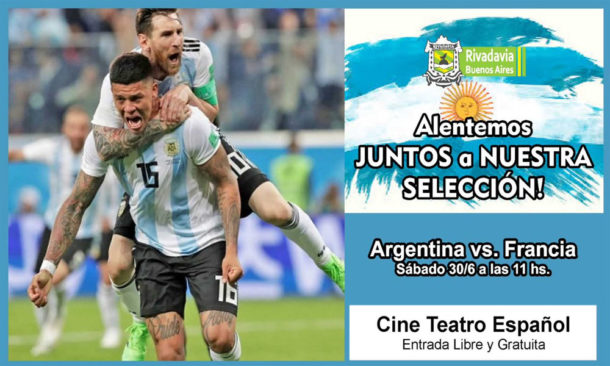 Para que todos puedan ver el partido correspondiente a los octavos de final entre Argentina y Francia, que se disputará el sábado 30 de junio a partir de las 11:00 horas, la Municipalidad de Rivadavia comunicó que el mismo se transmitirá por la pantalla gigante del Cine Teatro Español de manera libre y gratuita.