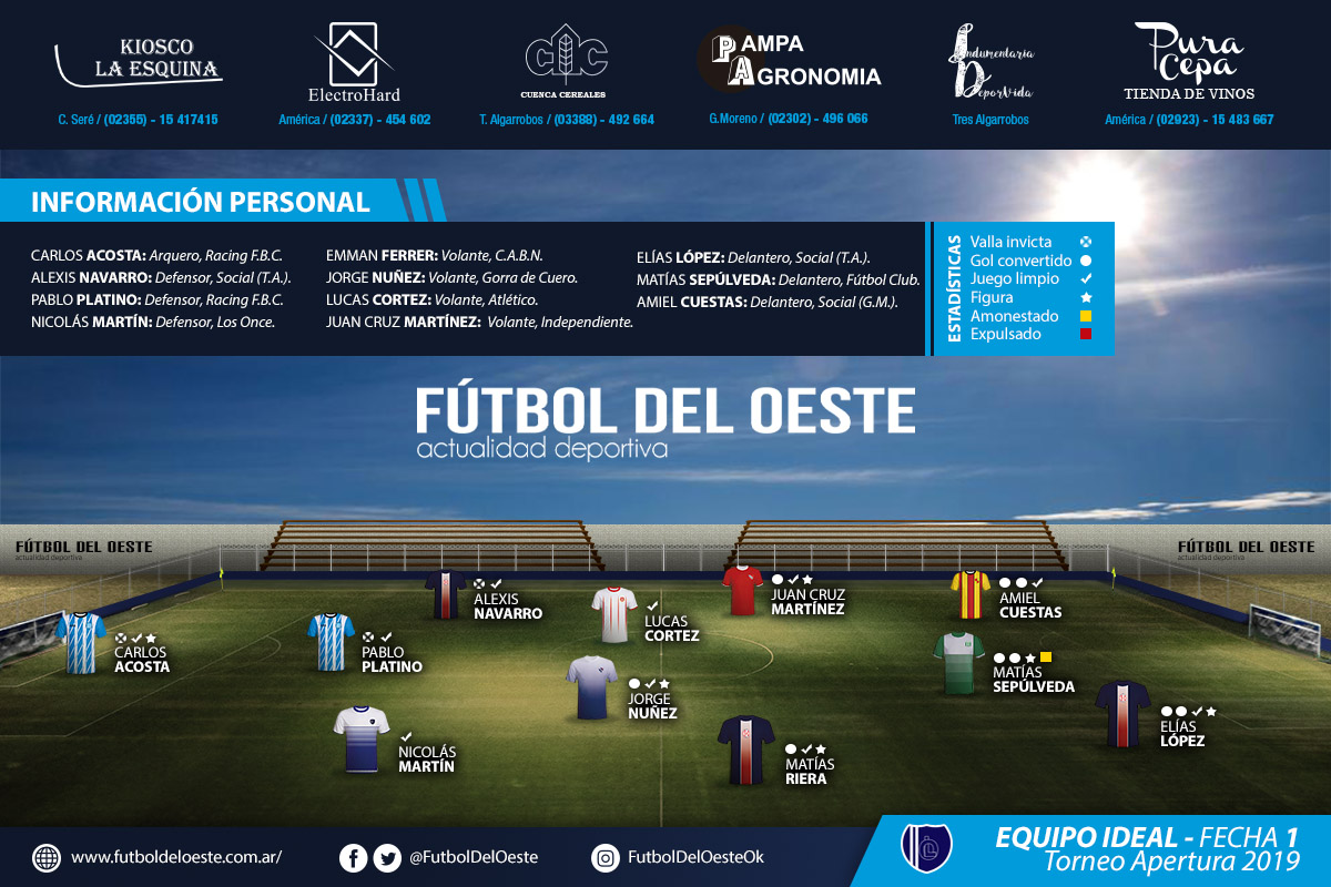Fútbol del Oeste te acerca el Equipo Ideal de la 1ª fecha del Torneo Apertura 2019. Entre estos once jugadores encontrarás a aquellos que convirtieron goles, fueron la figura del encuentro, a los que dejaron todo en la última línea para que su arco termine en cero, entre otras cosas.