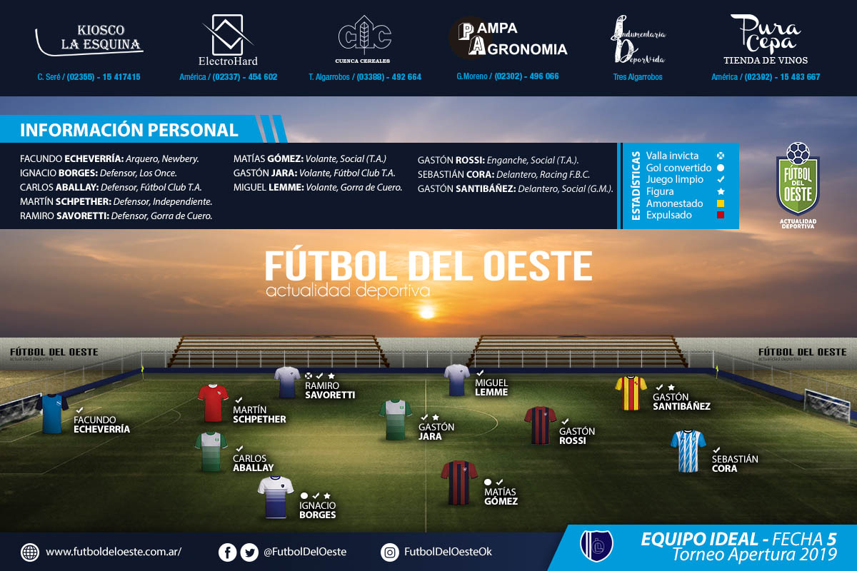 Fútbol del Oeste te acerca el Equipo Ideal de la 5ª fecha del Torneo Clausura 2019. Entre estos once jugadores encontrarás a aquellos que convirtieron goles, fueron la figura del encuentro, a los que dejaron todo en la última línea para que su arco termine en cero, entre otras cosas.