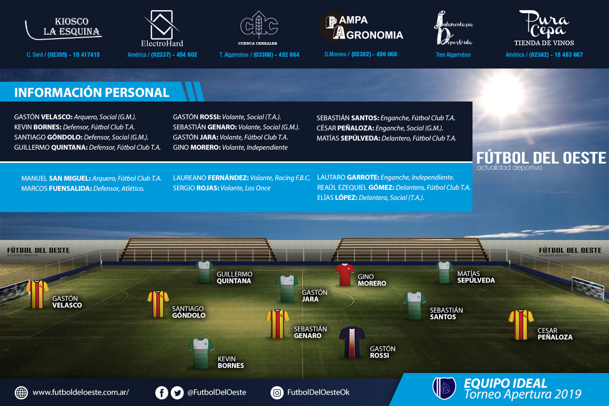 Fútbol del Oeste te acerca el equipo ideal del Torneo Apertura. Entre estos once jugadores encontrarás a los más destacados del primer certamen del año; los mismos fueron elegidos entre todos los entrenadores, integrantes de diferentes cuerpos técnicos, periodistas y corresponsales.