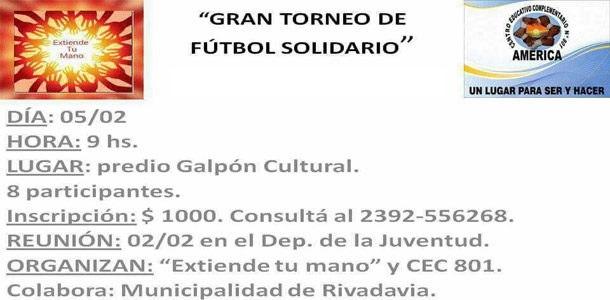La organización sin fines de lucro Extiende tu Mano, junto al Centro Complementario Nº 801, realizarán un torneo de fútbol solidario que se disputará en las instalaciones del Galpón de Deporte + Cultura de la ciudad de América.