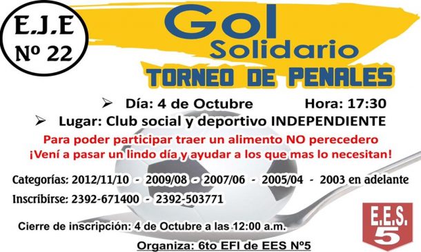 El viernes 4 de octubre a partir de las 17:30 horas, en la cancha auxiliar del estadio Anselmo Lobo de Independiente de América, se llevará a cabo un campeonato solidario de penales organizado por la Escuela Secundaria Nº 5 que tiene como fin colaborar con el comedor de la Escuela Primaria Nº 22 de la localidad.